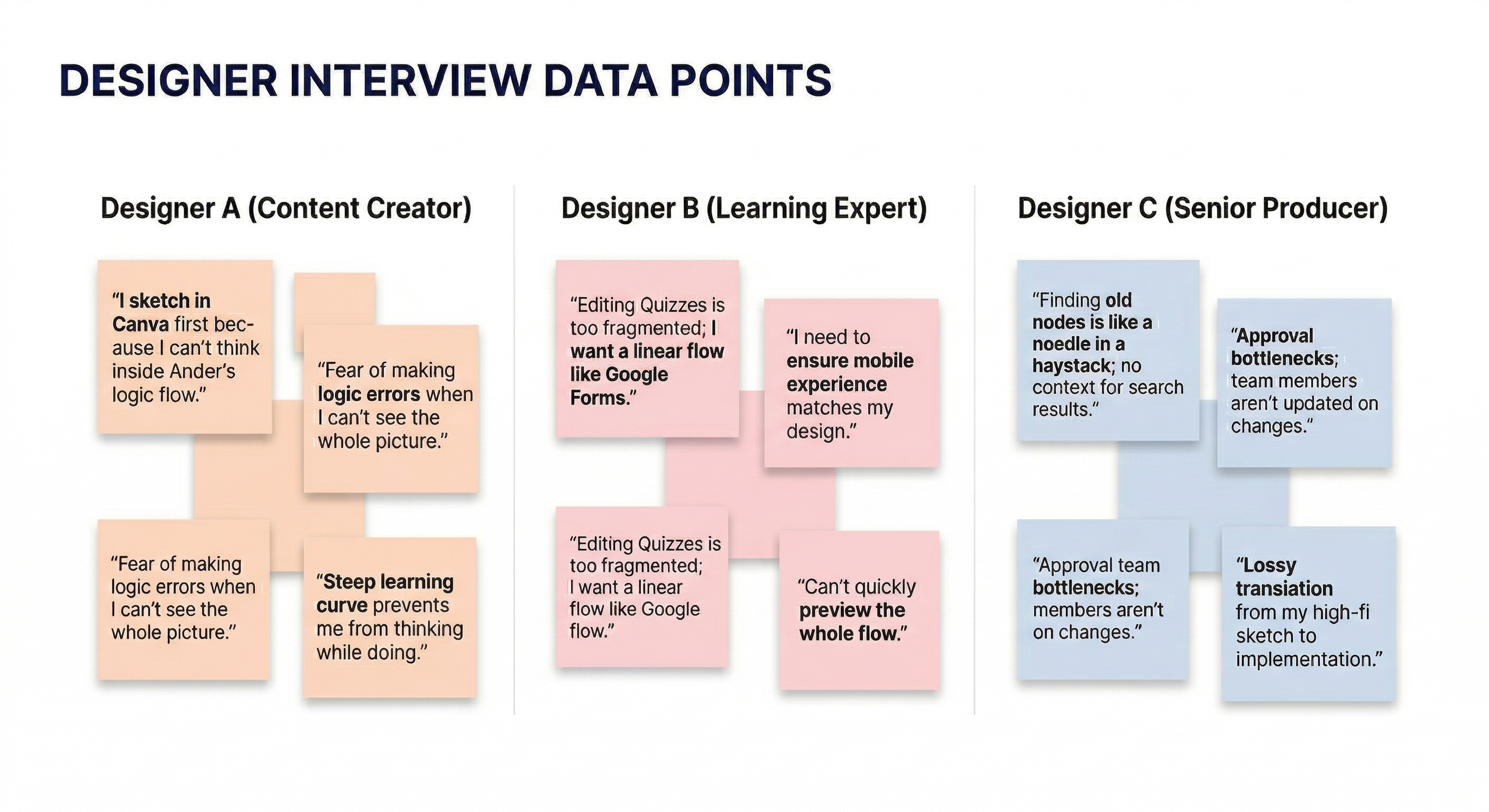 To pinpoint the root causes of declining engagement, I conducted qualitative research through deep-dive interviews with 6 internal participants. I prioritized qualitative insights over quantitative data because I needed to understand the "emotional friction"—the specific moments where designers felt so frustrated that they abandoned Ander Studio for external workarounds.